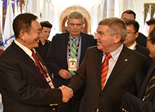中国自行车运动协会主席崔大林向国际奥委会主席巴赫介绍 必威betway瑞豹自行车